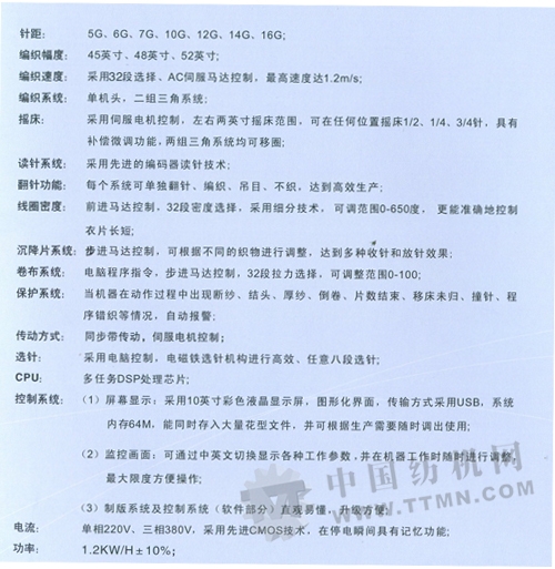 單機(jī)頭雙系統(tǒng),該系列為經(jīng)濟(jì)型無(wú)起底板裝置的全自動(dòng)電腦編織橫機(jī),采用數(shù)字化技術(shù)實(shí)習(xí)橫機(jī)的翻針、吊目、挑孔、無(wú)虛線嵌花、提花、明收針及其他規(guī)則花型編織功能。可編織基本針織組織(四平、單面等)、多色無(wú)規(guī)則提花、嵌花(引塔夏)、絞花、挑孔等緯編組織。適用于真絲、絹絲、合纖絲、羊毛、腈綸、混紡、紗線等原料編織毛衫成衣及圍巾、帽子、以及服裝附件。