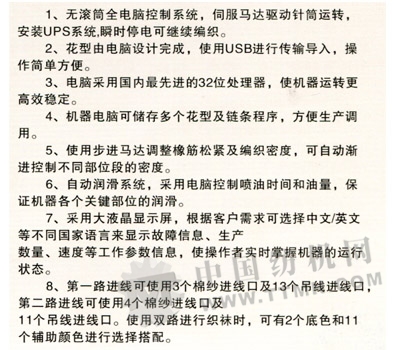 是全電腦控制的單針簡提花棉襪編織機,二路進線可織各種花樣的襪子,可編織Y型后跟,前后跟加固立體感襪子,可做單羅口及扎口,多層重疊羅口、網眼、集圈浮花效果的圖形。適用于織造各種男、女、童襪、短襪,平紋毛圈運動襪、休閑襪及隱形襪、立體襪等產品。