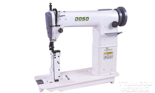 DS一810/820型高頭厚料機采用單知針線,潤柑排線,立式旋梭鉤線,形成雙線鎖式線跡,上下軸采用螺旋傘齒輪轉動。采用立柱式縫臺及滾輪壓腳,可方便地進行立曲縫制。適用于皮鞋、運動鞋、皮包等類似物品轉角縫紉。