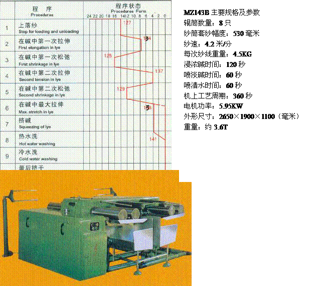 MZ143B型絞紗絲光機,用于棉紗的絲光處理,以增加棉纖維的強力和光澤,提高棉纖維對染料的親和力