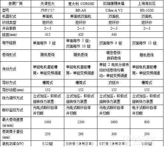 1.參展并紗機的主要性能及特點參展的并紗機主要技術參數及技術特征見下表