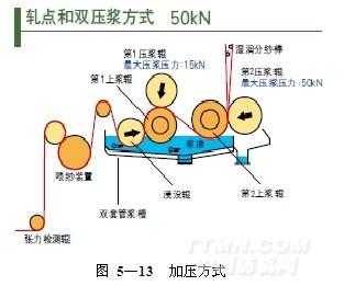 ④漿槽采用雙套管漿槽,通過新壓漿壓力控制,漿槽的壓力采用軋點和雙壓漿方式 (圖 5—13),第一壓漿輥:最大15KN、第二壓漿輥:最大 50kN;提高漿液的附著性能。最大壓漿壓力為 50kN,在原來最大壓漿壓力 40kN的基礎上提高25%的性能。通過高壓壓漿使漿液更滲透到紗線內部,使多余的漿液不附著在紗線的表面,從而能節約漿液。由于增加了壓漿壓力,能夠提高烘干效率,提高生產速度;