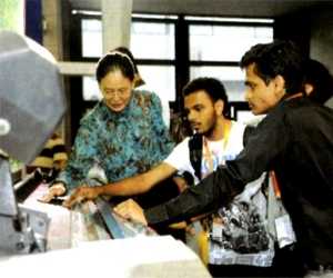 聊城由甲紡織機(jī)械有限公司總經(jīng)理張艷芹向國外客戶介紹產(chǎn)品性能