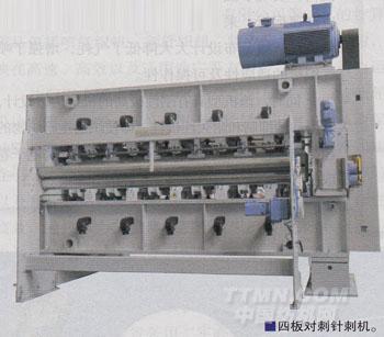 四板對刺高速針刺機(jī)應(yīng)用于生產(chǎn)皮革基布、過濾材料基布、汽車用氈毯和壁毯、上上布復(fù)合膜等,填補(bǔ)了國內(nèi)空白。其核心技術(shù)及創(chuàng)新點(diǎn)在于:四針板正位對刺,雙板正位對刺;在線調(diào)整針剌深度,開放式無曲軸箱,齒輪導(dǎo)向;人性化設(shè)計,針板氣囊夾緊便于更換;生產(chǎn)線配置中減少了每個單元機(jī)之間對布的牽伸,同等針剌強(qiáng)度要求下針剌密度下降;可用于預(yù)刺、主針剌、修而等。