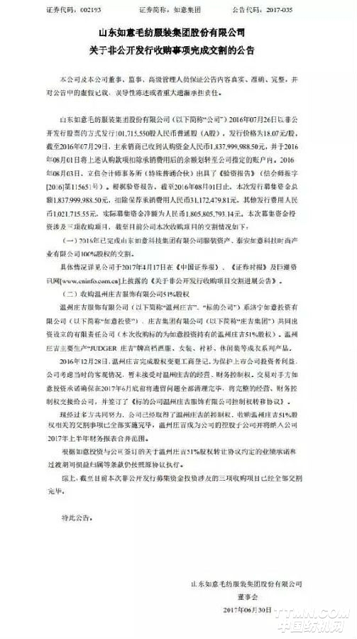 山東如意毛紡服裝集團股份有限公司(以下簡稱“山東如意”),6月30日發布公告稱,公司此前募資1.18億元收購的溫州莊吉服飾有限公司(以下簡稱“溫州莊吉”)51%股權方案已于近日落定。