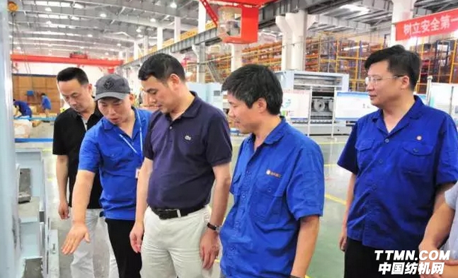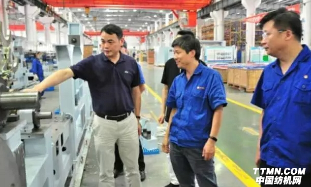 嚴華榮一行人首先來到非織造布設備裝配車間,呂宏斌介紹到,公司近年來非織造設備訂單飽滿,合同已排產到明年下半年。如此局面得益于鄭紡機始終秉承著“以技術服務保障客戶發展,以產品創新為客戶創造價值”的經營理念。注重設備可加工產品的靈活性和適應性,努力提升設備的信息化水平,整個生產過程具有在線監控、數據存儲與調用、故障分析及遠程運維系統,使工藝調整、故障排除功能更為完善。今年五月份,公司寬幅高產數字化水刺成套裝備在安徽滁州順利通過科技成果鑒定,專家一致認為該設備已達到國際先進水平。在水刺機裝配區,嚴華榮會長詳細了解了鄭紡機水刺線近幾年快速發展的成果,并給予了高度評價,希望雙方能夠在水刺非織造布個性化發展方面加強合作。