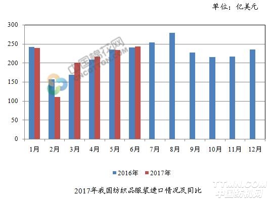 2017年1-6月,我國紡織品服裝累計出口額為1240.53億美元,同比增長0.36%,其中紡織品累計出口額為531.20億美元,同比增長2.10%;服裝累計出口額為709.33億美元,同比下降0.91%。