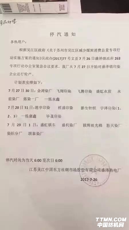 根據吳江區政府《關于蘇州市吳江區減少煤炭消費總量專項行動實施方案的通知》吳政辦【2017】77號文及7月26日盛澤鎮政府263專項行動辦公室緊急會議要求,我廠從7月27日開始對盛澤鎮印染企業進行輪產。