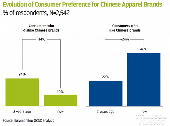 不過,該報告同時顯示,中國消費者對本土品牌的好感度從兩年前的22%上升到了46%。原因是新一代中國本土服裝品牌的興起,這讓中國消費者對本土品牌的喜好程度有所改善。