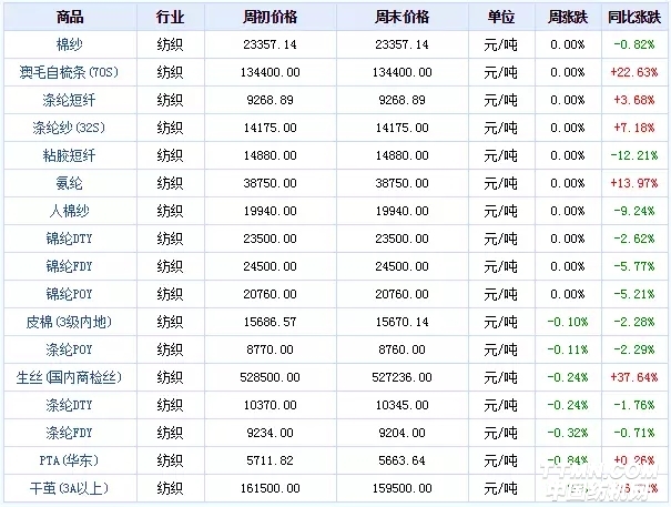 2018年第06周(2.5-2.9)紡織大宗商品價格漲跌榜