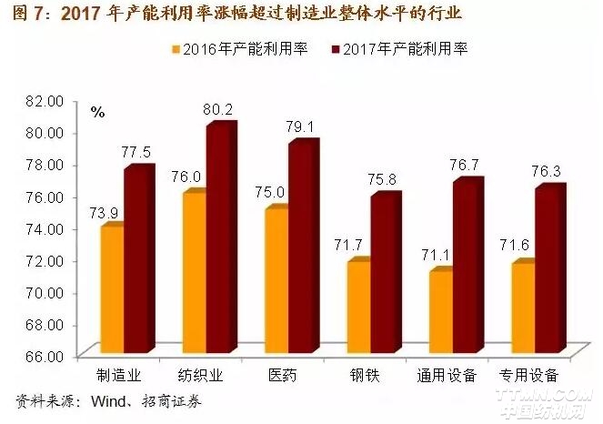 2017年我國制造業整體產能利用率為77.5%,較2016年上升3.6個百分點。分行業看,產能利用率漲幅超過制造業整體水平的行業有:紡織業、醫藥制造業、黑色金屬冶煉及壓延加工業、通用設備制造業和專用設備制造業。