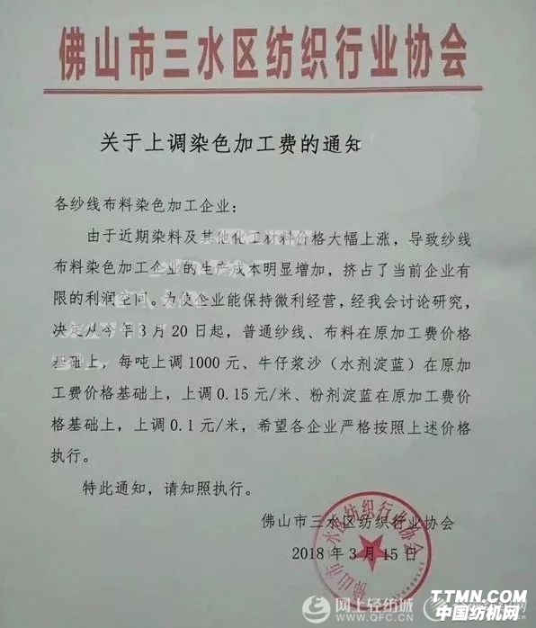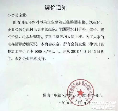 佛山市順德區紡織商會紡織印染分會調價通知