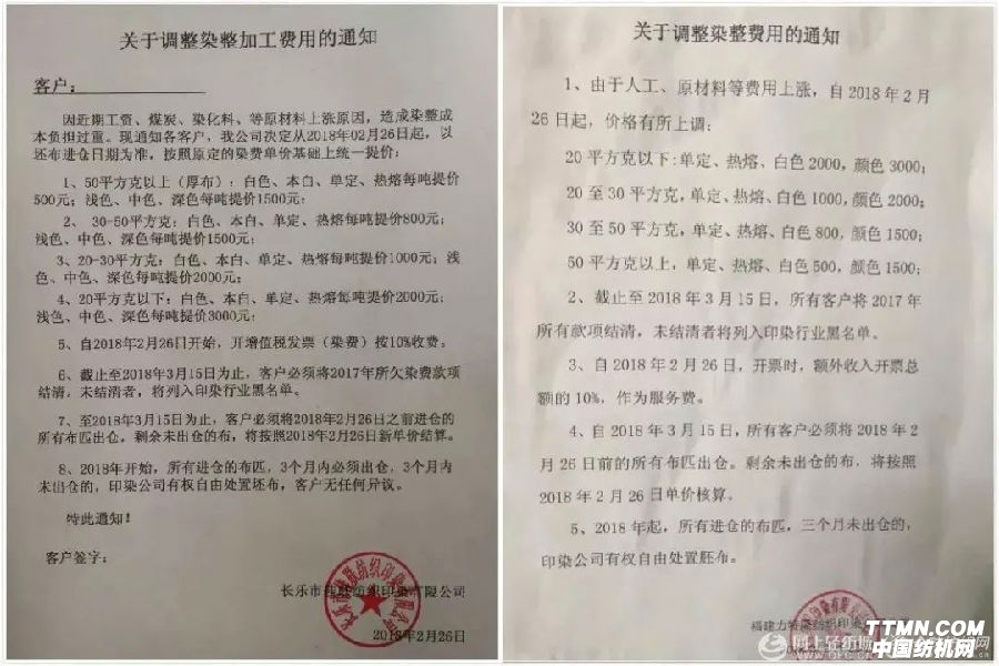 如2018年2月底,福建長樂等地區印染企業打響染費漲價第一炮。調價函稱,此次染費上漲的主要是基于近期染料、煤炭、工人工資等成本急劇上升的原因,企業負擔過重,不得不漲價。2018年3月初,南通地區11家印染企業統一發布提價函稱,企業的生存環境和生產空間受到了前所未有的挑戰,并在此節點上上調加工費用。