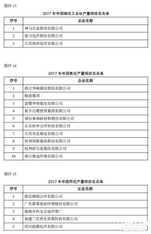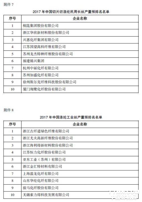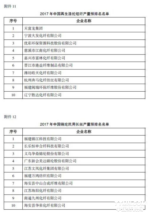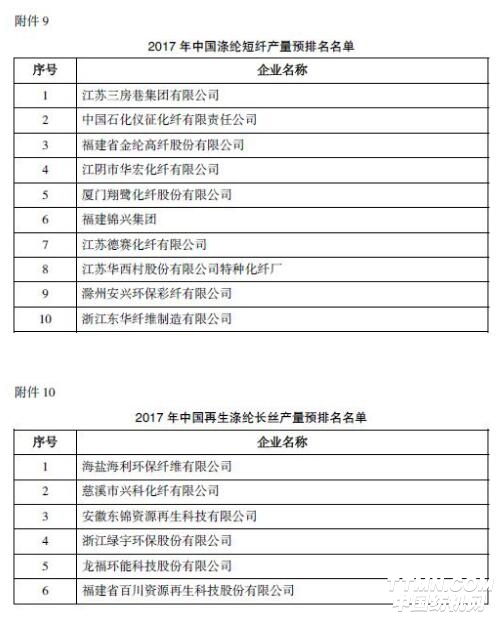海鹽海利環(huán)保纖維有限公司、慈溪市興科化纖有限公司、安徽東錦資源再生科技有限公司排名“2017年中國(guó)再生滌綸長(zhǎng)絲產(chǎn)量預(yù)排名”前三名。