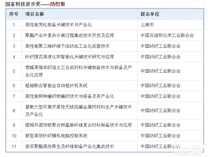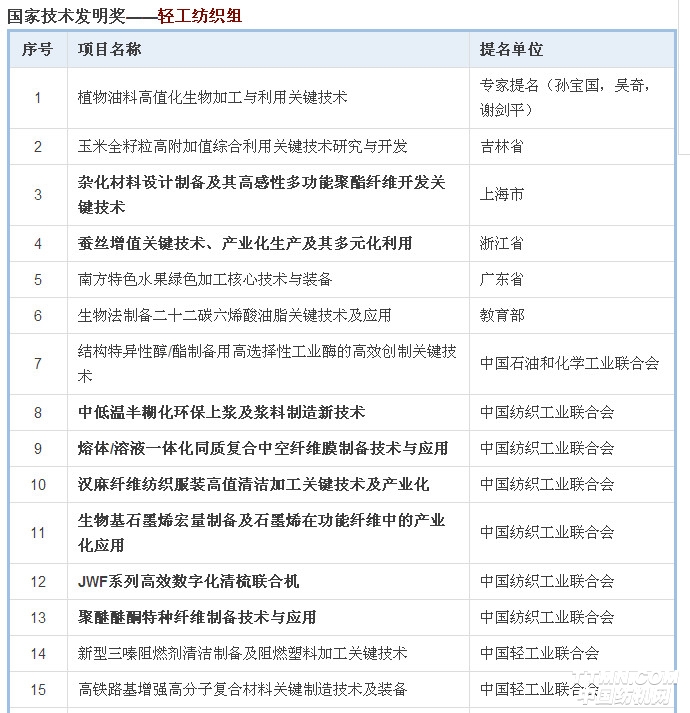 國家科學技術獎勵工作辦公室發布公告,2018年度國家科學技術獎提名工作已結束,共收到有關單位和專家提名的國家自然科學獎項目272項,技術發明獎項目306項(通用項目247項,專用項目59項),科學技術進步獎項目913項(通用項目793項,專用項目120項)。其中,紡織行業共有19項獲提名。