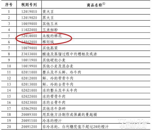 針對美國的第二輪清單,中國再次重拳出擊。4月4日,中國商務部發布《關于對原產于美國的部分進口商品加征關稅的公告》,將對原產于美國的大豆等農產品、汽車、化工品、飛機等進口商品對等采取加征關稅措施,稅率為25%,涉及2017年中國自美國進口金額約500億美元,“未梳的棉花”、“棉短絨”也在名單中。