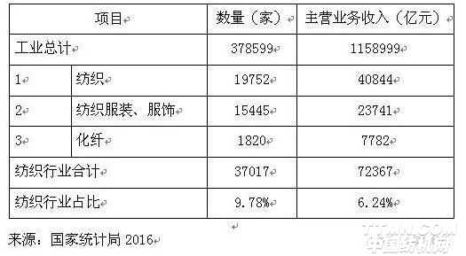 據統計,2016年我國規模以上紡織企業主營業務收入達72367億元,占全國規模以上企業營業收入的6.24%,紡織行業規模以上企業數量達37017家,占全國規模以上企業數量的9.78%。