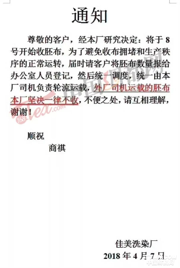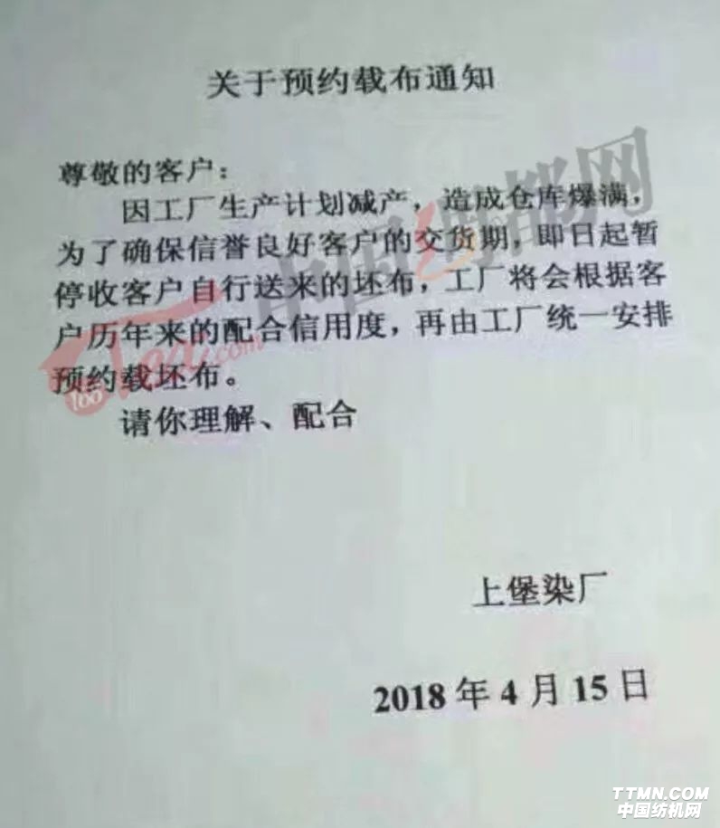 根據通知,由于染廠爆倉,客戶自行載來的坯布一律拒收,染廠方面將根據客戶登記信息、信譽程度等安排載布計劃。
