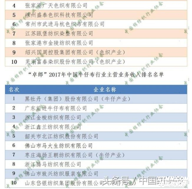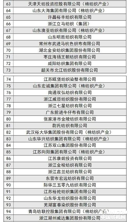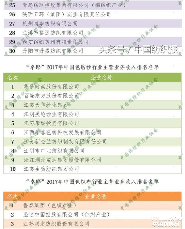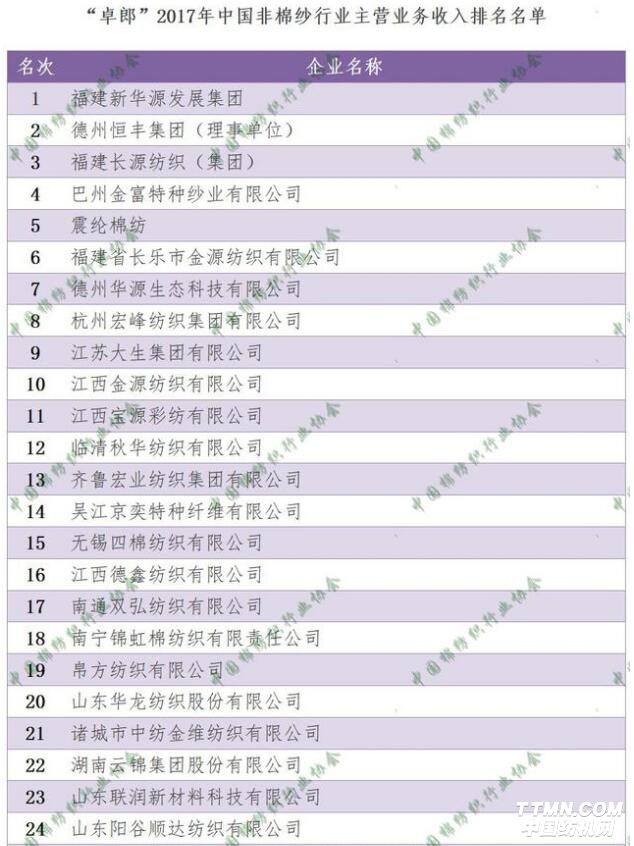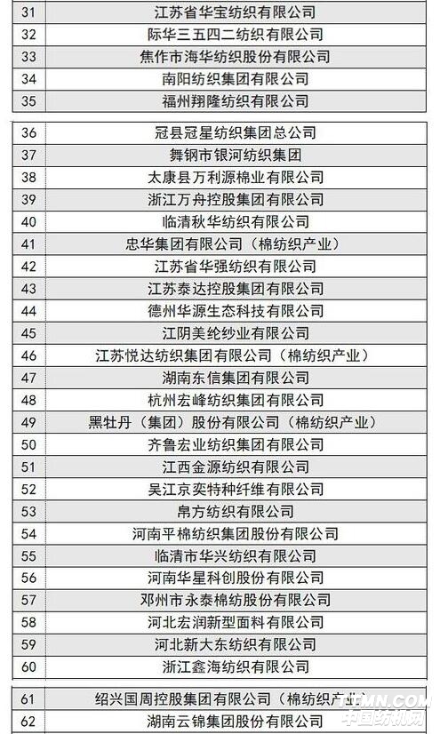 中國棉紡織行業協會同時按照分類產品的主營業務收入分別排出“非棉紗(棉混紡紗及化纖短纖紗)行業前30名”、“色紡紗行業前10名”、“色織布行業前10名”、“牛仔布行業前10名”企業名單。分類排名主要依據棉紡織企業該類產品的生產性銷售收入,參加分類排名企業只能選擇其中一類,其主導產品產量應占總產量比重的20%以上。