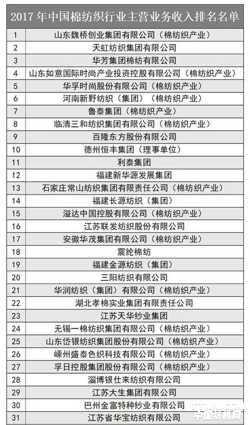 近日,中國棉紡織行業協會正式發布了“2017年中國棉紡織行業主營業務收入排名結果”。本次排名主要依據棉紡織企業生產性銷售收入,適當考慮紗布貿易等收入。本次排名中,山東魏橋創業集團有限公司、天虹紡織集團有限公司、華芳集團棉紡有限公司、山東如意國際時尚產業投資控股有限公司、華孚時尚股份有限公司、河南新野紡織(集團)、魯泰集團、臨清三和紡織集團有限公司、百隆東方股份有限公司、德州恒豐集團分別位居榜單前10位。與2016年中國棉紡織行業主營業務收入排名榜單相比,上榜的前10名企業基本穩定,位次變化不大。魏橋、天虹、華芳、如意仍然穩居榜單前4位,河南新野、百隆東方仍分別位居第6位和第9位。華孚從上年榜單的第8位晉升到第5位,德州恒豐則從排名的第12名晉級至第10名。