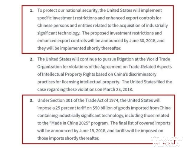 聲明還稱,根據《1974年貿易法》第301條,美國將對從中國進口的包括高科技產品在內的總值500億美元的產品征收25%的關稅,其中包括與“中國制造2025”計劃相關的產品。最終的進口商品清單將于2018年6月15日之前公布,稍后將對這些進口產品征收關稅。