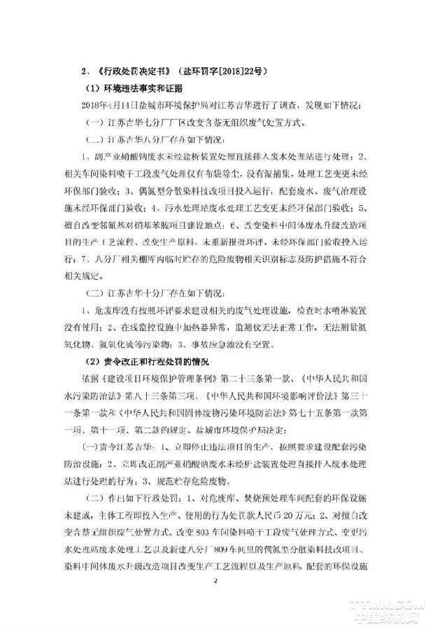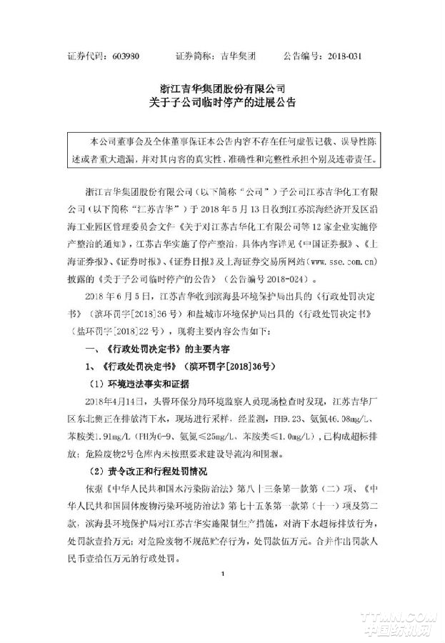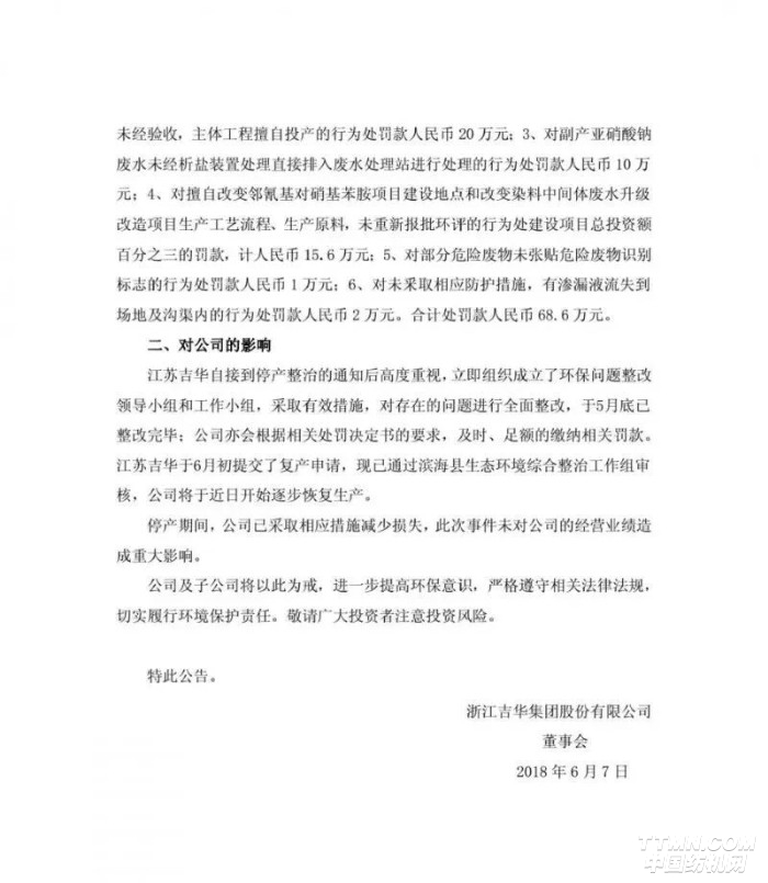 6月7日,吉華集團發布公告,其子公司江蘇吉華6月5日收到環保局的處罰決定書,共被罰款83.6萬元;并于6月初提交了復產申請,已通過濱海環保綜合整治工作組審核,將于近日逐步恢復生產。