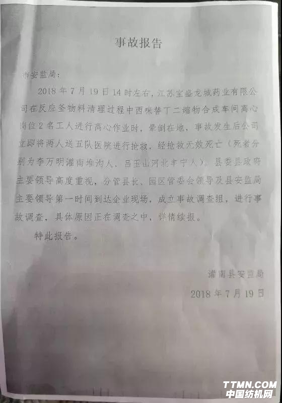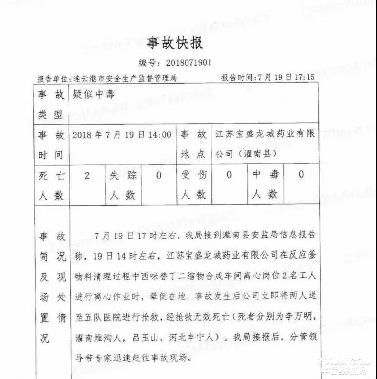 從連云港安全生產(chǎn)監(jiān)督管理局獲悉,2018年7月19日14時(shí)左右,我局接到灌南縣安監(jiān)局信息報(bào)告簡(jiǎn)況稱,19日14時(shí)左右,江蘇寶盛龍城藥業(yè)有限公司在反應(yīng)釜及物料清理過程中西咪替丁二縮物合成車間離心崗位2名工人進(jìn)行離心作業(yè)時(shí),暈倒在地,事故發(fā)生后公司立即將兩人送至五隊(duì)醫(yī)院進(jìn)行搶救,經(jīng)搶救無(wú)效死亡(死者分別為李萬(wàn)明,灌南堆溝人,呂玉山,河北豐寧人)。我局接報(bào)后,分管領(lǐng)導(dǎo)帶專家迅速趕往事故現(xiàn)場(chǎng)。