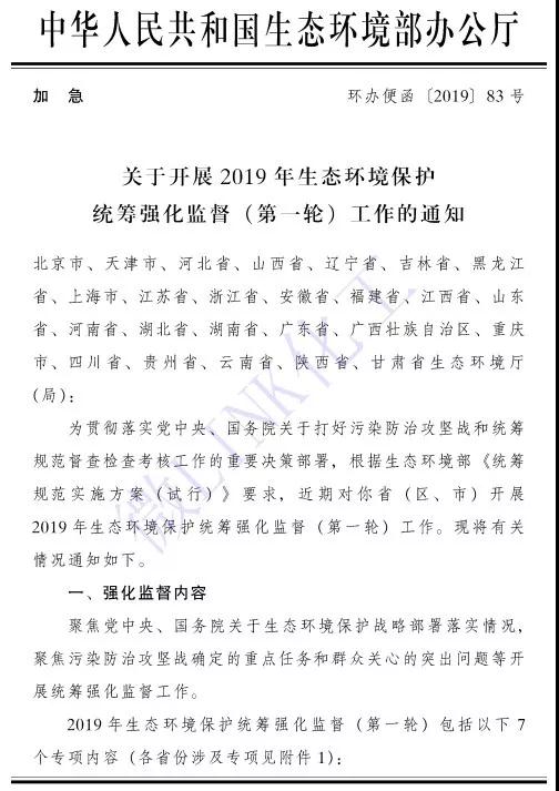 近日,生態環境部辦公廳加急印發《關于開展2019年生態環境保護統籌強化監督(第一輪)工作的通知》,文件里涉及全國25個省和直轄市,包括了廣東、廣西、福建、山東、江蘇等省份。