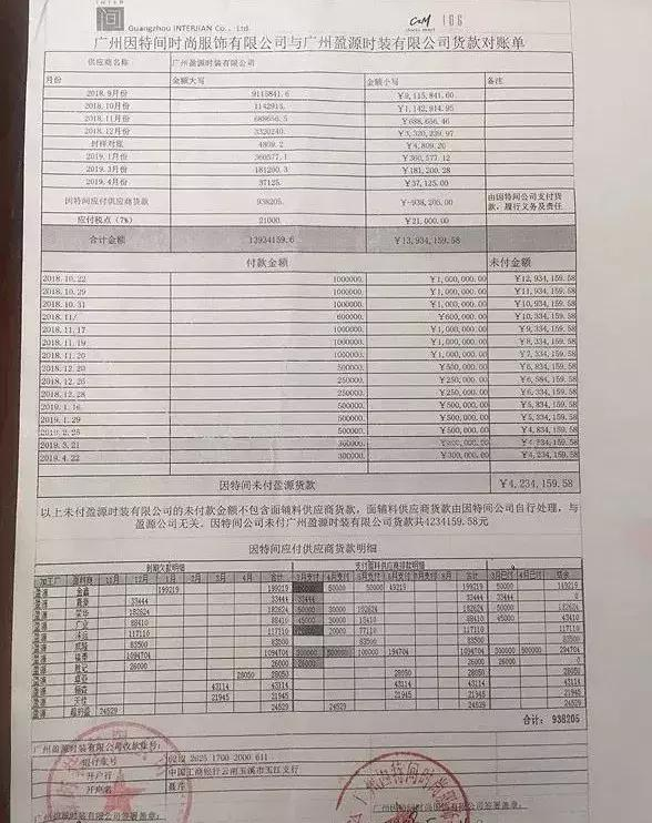 王蒞韋、王興生、楊五四以及公司高管目前不接聽供應(yīng)商、加盟商的電話,通過中間人傳話:公司正在進(jìn)行“資產(chǎn)重組”,進(jìn)行“債轉(zhuǎn)股”造作,妄圖讓新的、不知情的、或者是沒有看清楚他們?cè)p騙手段的公司或中小企業(yè)主接盤。但是據(jù)我們所知,廣州市因特間時(shí)尚服飾公司拖欠200多家供應(yīng)商的貨款,總金額超過1億元。
