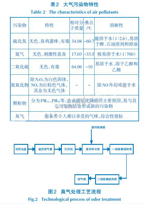 目前,國內外針對紡織印染廢水異味氣體特點,常采用的處理方法有物理凈化法、化學凈化法[7]、生物凈化法及綜合凈化法。項目根據大氣污染物特性(表1)設計臭氣處理工藝流程,采用凈化塔+一級除臭吸附塔+二級除臭吸附塔處理,詳見圖2。