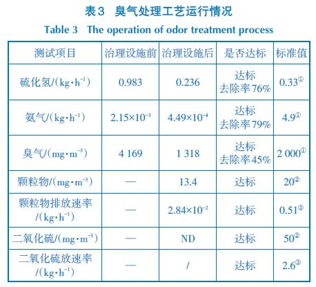 該臭氣處理工程完工后,系統運行情況良好,臭氣處理效果達到標準要求,主要污染物硫化氫、氨氣、臭氣去除率分別為76%、79%、45%。具體運行情況見表3。