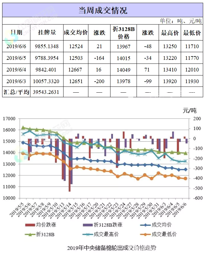 上周(2019年6月3-6日)是2019年中央儲(chǔ)備棉輪出第五周,中國(guó)儲(chǔ)備棉管理有限公司累計(jì)掛牌儲(chǔ)備棉3.95萬(wàn)噸,其中新疆棉1.94萬(wàn)噸,地產(chǎn)棉2.01萬(wàn)噸。