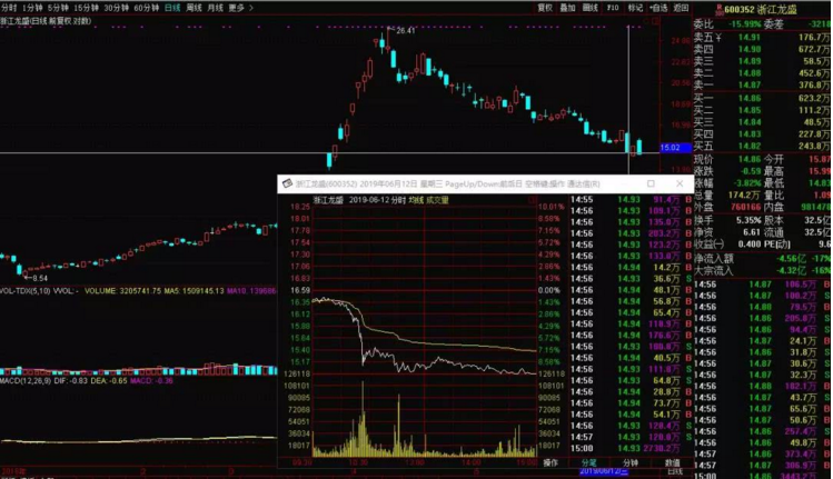 從圖上可以看到,光標(biāo)所在的位置,是6月12日,周三,突然間股價(jià)一落千丈,觸及跌停,形成了閃崩。
