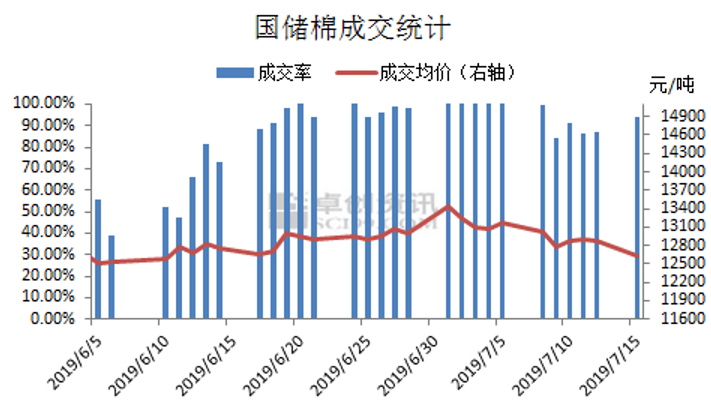 首先,從上周成交率來看,雖有下降,但基本80%~90%范圍浮動,也就是說還是有一大部分企業在進行采購。根據國家監測系統最新企業采購意愿調查顯示,7月初,準備采購棉花的企業占56.6%,持觀望態度的占37.3%,不打算采購棉花的占6%,所以企業采購意愿有顯著提升。