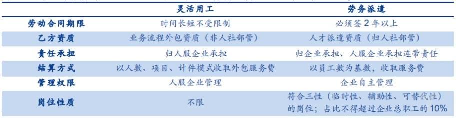 靈活用工主要是指以崗位外包形式為企業提供彈性用工的雇傭模式,以解決企業突增的、高峰期的、季節性的人員需求,實現因需而變,減少用人的風險和成本。采用靈活用工模式,可以幫助企業減少正式員工人數,實現用工風險平均降低 50%,用工彈性提升30%的效果;而且可以為企業節省用工成本,因為企業只需支付員工任務期限內的薪酬,并且是按實際工作的時長/天數付費。而且與勞務派遣相比,靈活用工具有勞動合同時間長短不受限制,雇員的管理責任由人力資源服務企業承擔,雇員崗位不受限制等優勢,未來會逐漸得到企業管理者的青睞。