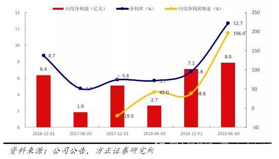 2019年8月14日,公司發布中期業績公告,2019H1公司營收同比增長33%至62.55億元,歸母凈利潤同比增長196%至7.95億元。業績超市場預期。