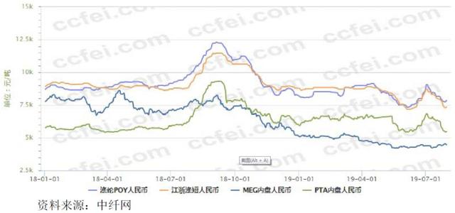 以滌綸為例,市場在經過去年四季度的大幅下跌之后,有反彈的意愿,同時國際原油價格上漲形成成本端的支撐,1~4月,市場小幅走高,但無奈需求低迷,5月中美貿易戰壓力加大導致化纖市場各類產品價格快速下跌,恒力煉化項目投產加大了滌綸下跌的深度。6月價格降至低位,下游逢低買入促使市場成功觸底,隨著G20會議后貿易戰重新緩和,形成一波短期的上漲行情。但需求并沒有實質性的好轉,7月,價格又回歸基本面進入下跌通道。