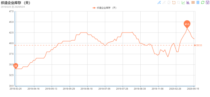 進入五月,市場行情稍有回暖,走貨較前期也有好轉。據中國綢都網統計數據來看,目前江浙地區坯布庫存較前期有所下降,現在坯布庫存集中在41天左右。