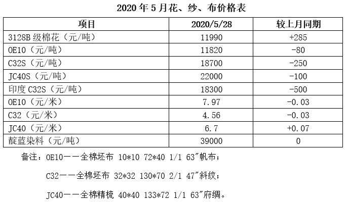 5月,國內(nèi)棉花現(xiàn)貨價(jià)格小幅振蕩上漲,市場(chǎng)少量成交;紗線市場(chǎng)行情略有好轉(zhuǎn),常規(guī)品種銷售情況較好,價(jià)格偏弱;坯布市場(chǎng)內(nèi)銷訂單稍見起色,產(chǎn)能利用率維持穩(wěn)定,市場(chǎng)信心有所恢復(fù)。