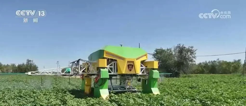 在新疆昌吉州國(guó)家級(jí)農(nóng)業(yè)高新技術(shù)示范區(qū),這個(gè)可以根據(jù)棉花生長(zhǎng)高度動(dòng)態(tài)調(diào)節(jié)和360原地調(diào)頭的機(jī)器人正在對(duì)棉田進(jìn)行水肥管理。12米長(zhǎng)的機(jī)械臂上安裝了31個(gè)不同的噴頭,能夠同時(shí)向棉株的不同部位噴施水肥。