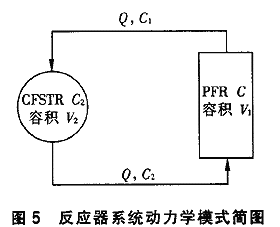 從圖4可以看出,反應系統的容積越大,4BS降解脫色速率越小。這一點可從下述反應器理論 得到解釋。根據系統中各組分的形狀及其內部水流的流態,可認為系統的有效反應區為理想推流式反應 器(PFR),其容積為V1,屬光化學反應有效容積;其余部分(固液分離器、曝氣水箱、 水泵和管道等)可近似看作恒流攪拌反應器(CFSTR),無化學反應,其容積為V2,屬無 效容積。系統模式見圖5。