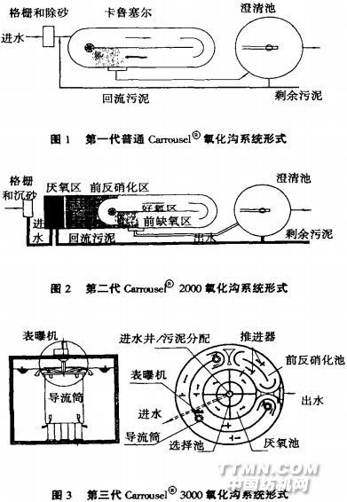 第一代為普通Carrousel氧化溝,該種形式氧化溝以去除BOD為主要目的,并具一定的脫氮除磷效果;第二代為Carrousel2000氧化溝,該種形式氧化溝主要是針對排放標(biāo)準(zhǔn)對氮、磷的嚴(yán)格要求而發(fā)展起來的具有脫氮除磷的工藝;第三代是Carrousel3000氧化溝,其最顯著的特點(diǎn)是水深很大,減少了占地面積,同時也具備脫氮除磷功效。如圖1、圖2和圖3所示。