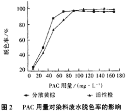 所做的4類8種染料的模擬廢水的絮凝試驗表明,在不加脫色劑的情況下,采用無機絮凝劑如氯化鋁、硫酸鋁、硫酸亞鐵等的脫色絮凝效果皆不理想,聚合氯化鋁對染料廢水的脫色絮凝效果明顯優于其它無機絮凝劑,但對于部分活性染料、酸性染料的脫色絮凝效果較差若將脫色劑與PAC配合使用,不僅可有效降低絮凝劑的用量,而且絮體形成速度與沉降速度大大加快,污泥量少,表