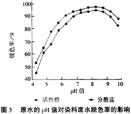 2.4 酸度對脫色率的影響 染料溶液的pH值是影響脫色絮凝效果的一個重要影響因素。試驗了脫色劑用量為 1.0 ml/L,PAC用量為60mg/L時pH值對染料脫色的影響,結果見圖