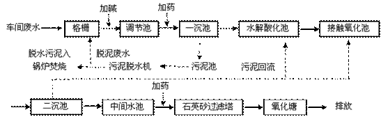 進水水質:pH=5~6.5,ρ(CODcr)= 600~800mg/L,ρ(BOD5)=100~400 mg/L,ρ(SS)=100~200 mg/L,色度100~400倍。 出水水質:執行《紡織染整工業水污染物排放標準》(GB4287-92)3中Ⅰ級標準:ρ(CODcr) 100 mg/L,ρ(BOD5) 25 mg/L,ρ(SS) 70 mg/L,色度40倍。