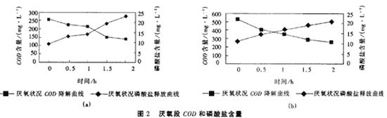 取表1中第1、3組數據的厭氧段作圖為圖2。 試驗結果表明,經過1.5h厭氧后,磷的釋放基本達到最大,此時COD降解也基本完成。好氧階段在3-4h內就可以達到最大的磷吸收量,以后再增加好氧時間,出水磷濃度不再降低,這說明此時無論是污泥的內源基質還是外源基質均已消耗殆盡。由此綜合考慮除磷效果和經濟指標,本實驗確定厭氧時間為1.5h,好氧時間為4h。