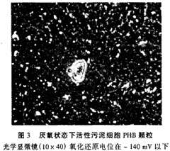 2.3 活性污泥直接染色結果 對活性污泥直接染色的研究結果表明,在好氧厭氧交替生物除磷中,污泥吸收和釋放磷的基本情況與污水中的溶解氧及氧化還原電位有著一定的關系。在厭氧過程中,當氧化還原電位低于-140mV此時污水中溶解氧含量很低,對污水中活性污泥進行染色能發現大量的PHB存在,說明活性污泥細菌細胞內磷的含量低,處于磷的釋放階段;當污水中有少量氧存在,即此時氧化還原電位為-140~-100mV,污泥細菌細胞的染色表明其中PHB的含量減少;當對污泥進行曝氣,形成好氧階段,水中溶解氧增加,氧化還原電位高于100mV,對污泥細菌細胞進行染色表明,PHB含量極低,幾乎難以染色出來,證明細菌細胞大量吸收了磷。