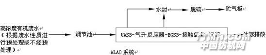 1 簡(jiǎn)介 厭氧-低氧-厭氧-好氧一體化廢水處理系統(tǒng)(Anarebic-Low oxic-Anareobic system, 簡(jiǎn)稱ALAO system),該系統(tǒng)將厭氧,低氧,厭氧,好氧等操作單元組合在一起,處理效率更高,占地面積更少,投資更省,運(yùn)行費(fèi)用更低。2 工藝流程