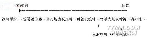 1995年初,在小試的基礎上,通過將原虹吸濾池的6個濾格均改造為氣浮式虹吸濾池,實現了混凝沉淀-氣浮過濾的新工藝,流程如下:
