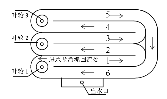 由圖可見,Carrousel氧化溝使用定向控制的曝氣和攪動裝置,向混合液傳遞水平速度,從而使被攪動的混合液在氧化溝閉合渠道內(nèi)循環(huán)流動。因此氧化溝具有特殊的水力學(xué)流態(tài),既有完全混合式反應(yīng)器的特點,又有推流式反應(yīng)器的特點,溝內(nèi)存在明顯的溶解氧濃度梯度。氧化溝斷面為矩形或梯形,平面形狀多為橢圓形,溝內(nèi)水深一般為2.5~4.5m,寬深比為2:1,亦有水深達